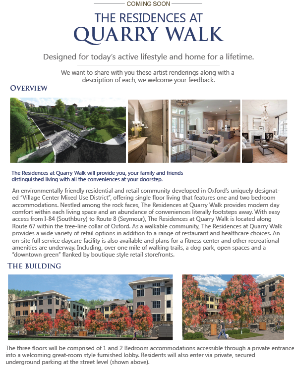 Quarry Walk is located along Route 67 within the tree-line collar of Oxford. As a walkable community, The Residences at Quarry Walk provides a wide variety of